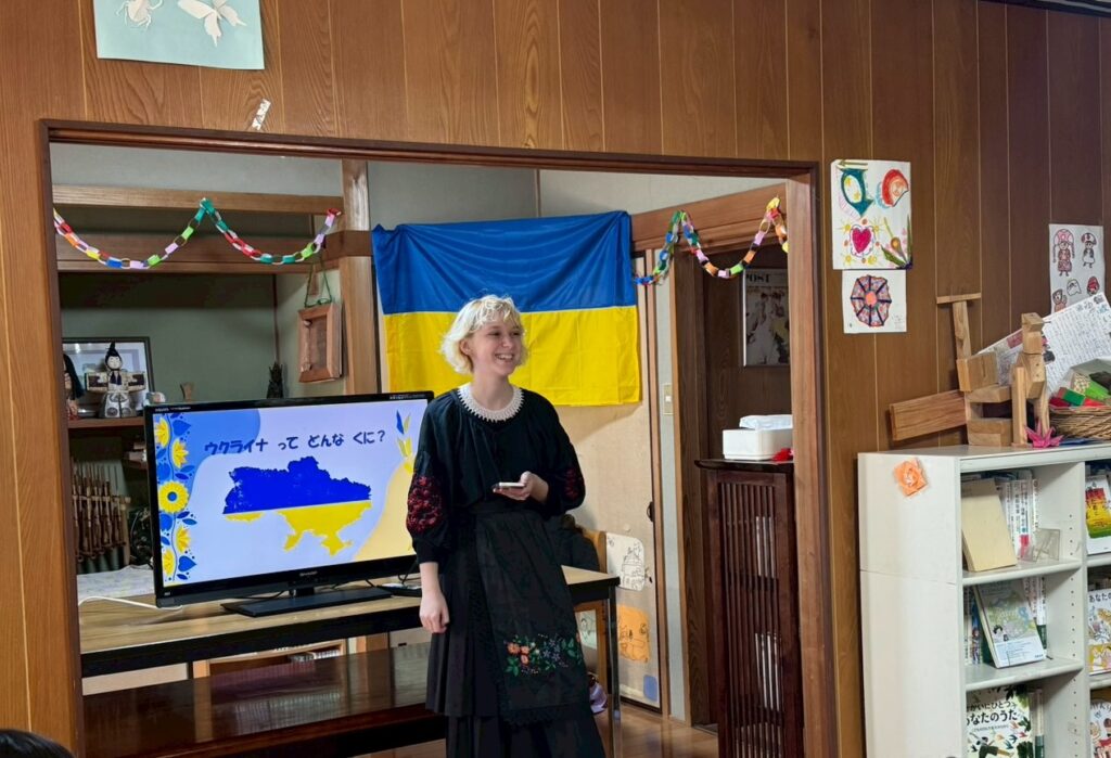 Поки борщ варився, Софія (UAFukuoka) провела презентацію про Україну, адаптовану для дітей — про відстань від Японії до України, порівняння розмірів країн, їжу, культуру та столицю Київ та багато інших цікавинок. На початку вона запитала дітей, що вони знають про Україну. Відповідь була одна: «війна». На жаль, це було єдине, що вони чули про Україну. Ми сподіваємося, що після цього заходу діти запам’ятають також борщ, дружбу та українську культуру. Соня завершила презентацію словами, які відгукнулися у серці кожного в залі: Україна — це не лише війна. Це країна, сповнена життя, любові та щирого прагнення до миру.